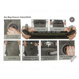 To Use: Simply fold the opening downward on the side with the black lines twice, roll it down as far as possible, click the buckle closed, then turn the valve closed (clockwise). See above for detailed instructions and accompanying images.​​
